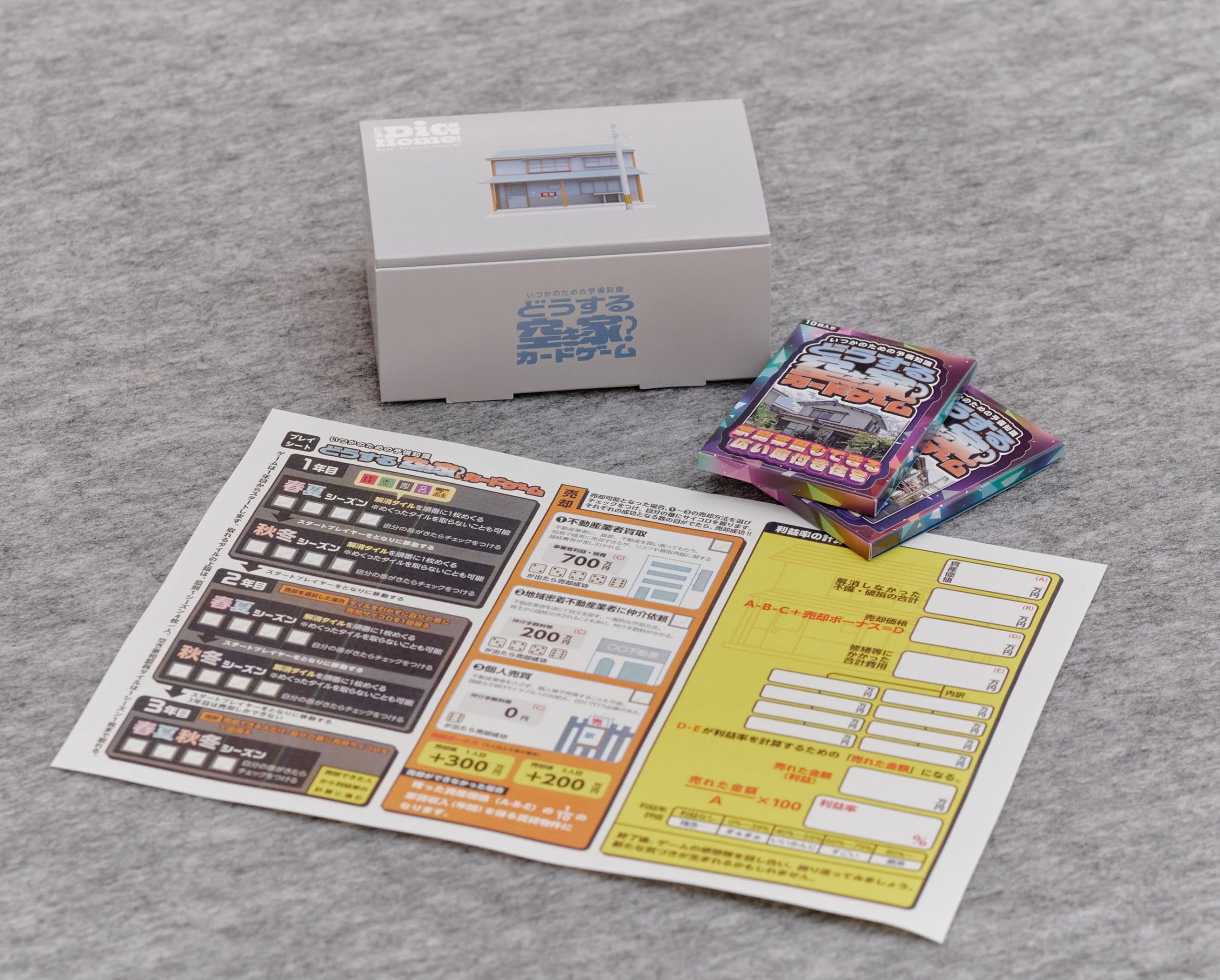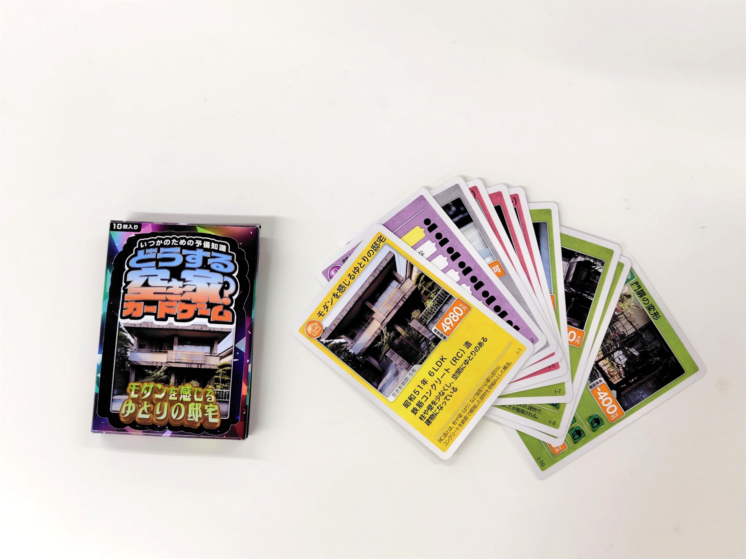 パックの中には10枚のカードが入っています。黄色は家の情報が書かれたカード、赤は建物の破損状態を表すカード、緑はお風呂やトイレなど設備等の不備の状態を表すカード、黒は家の登記がされていないなど書類の不備の状態を表すカード、紫は親族の説得状況を表すカードです。