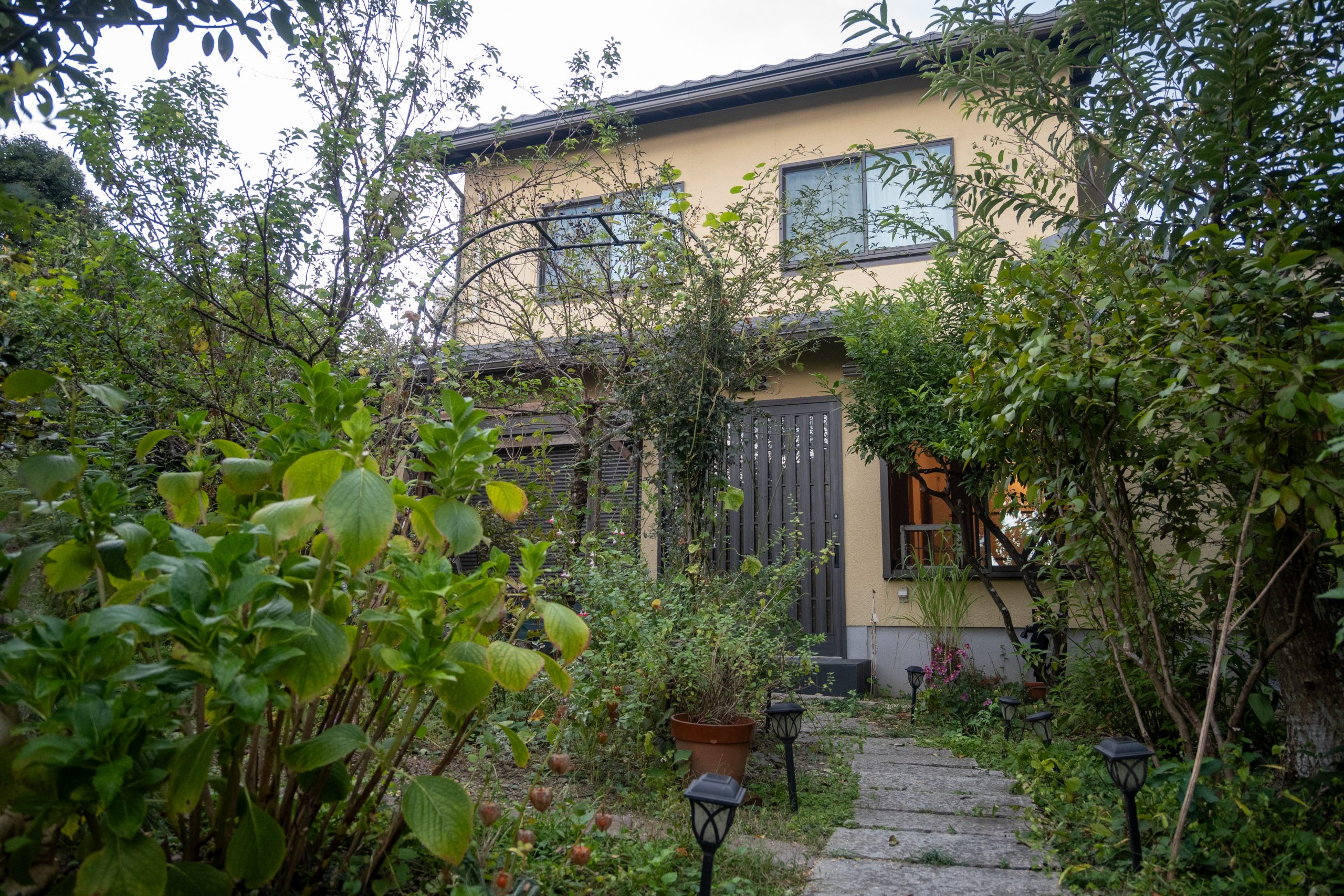 Yさん邸が建つのは、豊かな自然が身近にある世界遺産・仁和寺のすぐ近く。庭には大小さまざまな樹木があり、それぞれ花が咲き、なかには見事な実をつけたシークヮーサーも見られます。ここはかつてYさん自身が育った家でもあり、少し前まではお母様が一人で暮らしていたため、たびたび訪れていた思い出の詰まった住まいです。