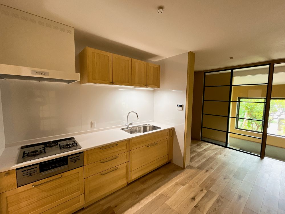 台所はナチュラルな木の扉のシステムキッチンに一新。いくつかショールームを見て回り、家具のようなデザインのものを探していたところ、偶然見かけて、一目惚れして決めたのだそう。