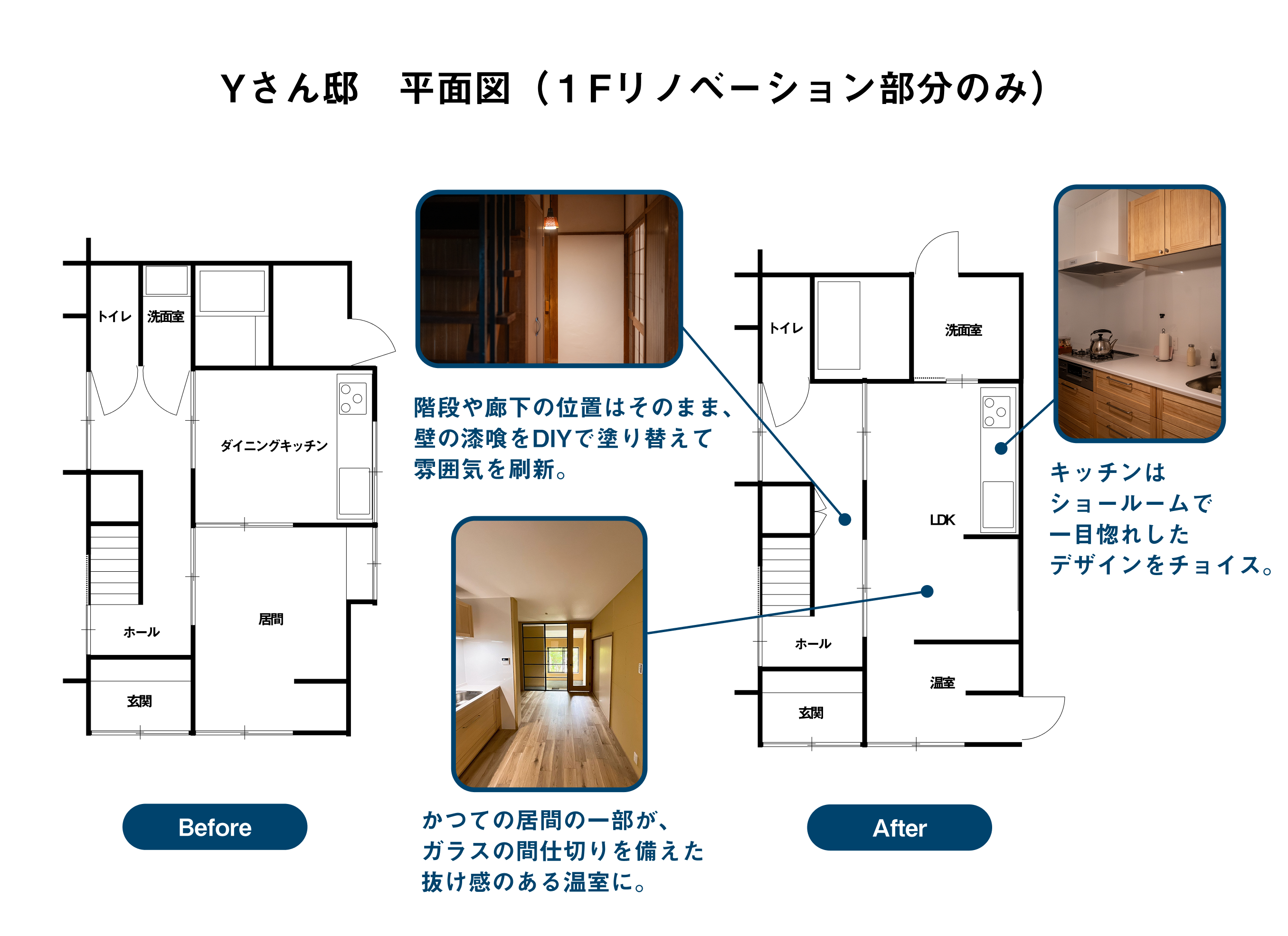 Yさんが小学校に上がる頃に建てられたというこのお家。元の作りがしっかりしていたことから、間取りや廊下、階段の位置は変えずに、これから住まうYさんのこだわりを最大限活かした空間づくりが行われました。