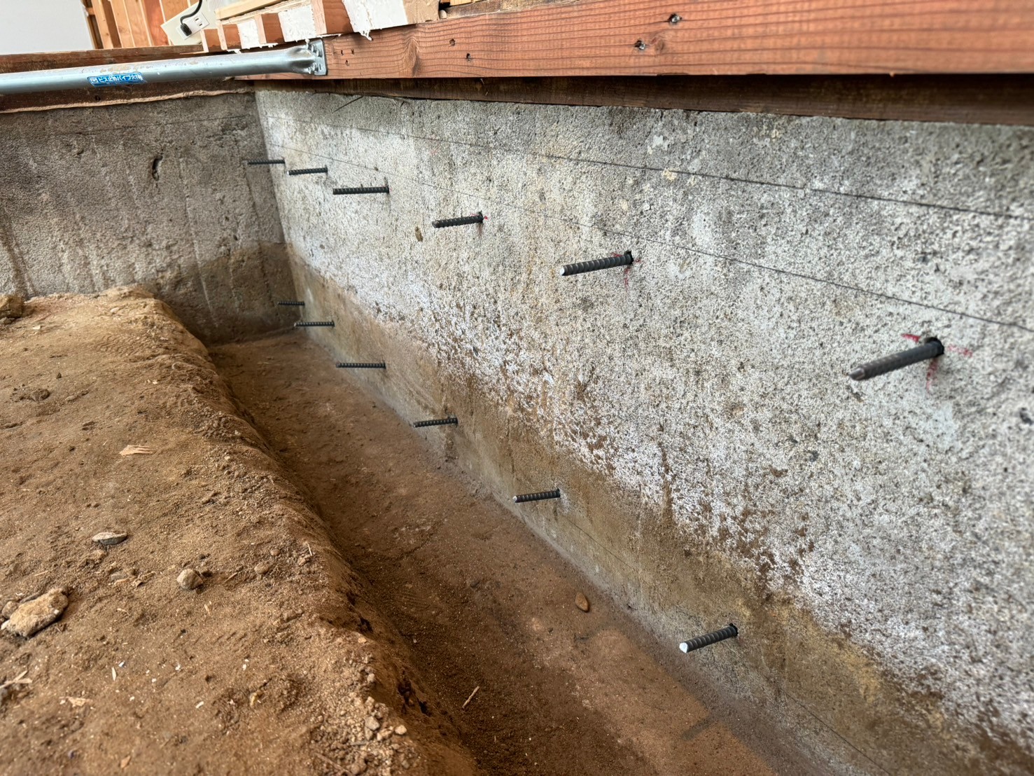 「地震や台風による水平方向からの力に耐えうる壁を耐力壁と呼ぶのですが、今回のリノベーションでは既存の壁を強化してゆくことで、窓などはそのままで開放的な空間を作ることができました。 基礎については、1981年以前(旧耐震基準)の建物の基礎は鉄筋なしの無筋コンクリートだったりして、どうしても弱いんですよね。それで基礎をやり直そうと思うと、やはりその付近の床を剥がさないといけません。 ただ、今回は全面的に剥がすのではなく、十分強度が上がるという範囲を限定して基礎の補強を実施しました。リビングと寝室の床を剥がし、無筋コンクリートの基礎に鉄筋コンクリートの基礎を沿わせて……結果、大工さんに補強アンカーを200本打ってもらいました」