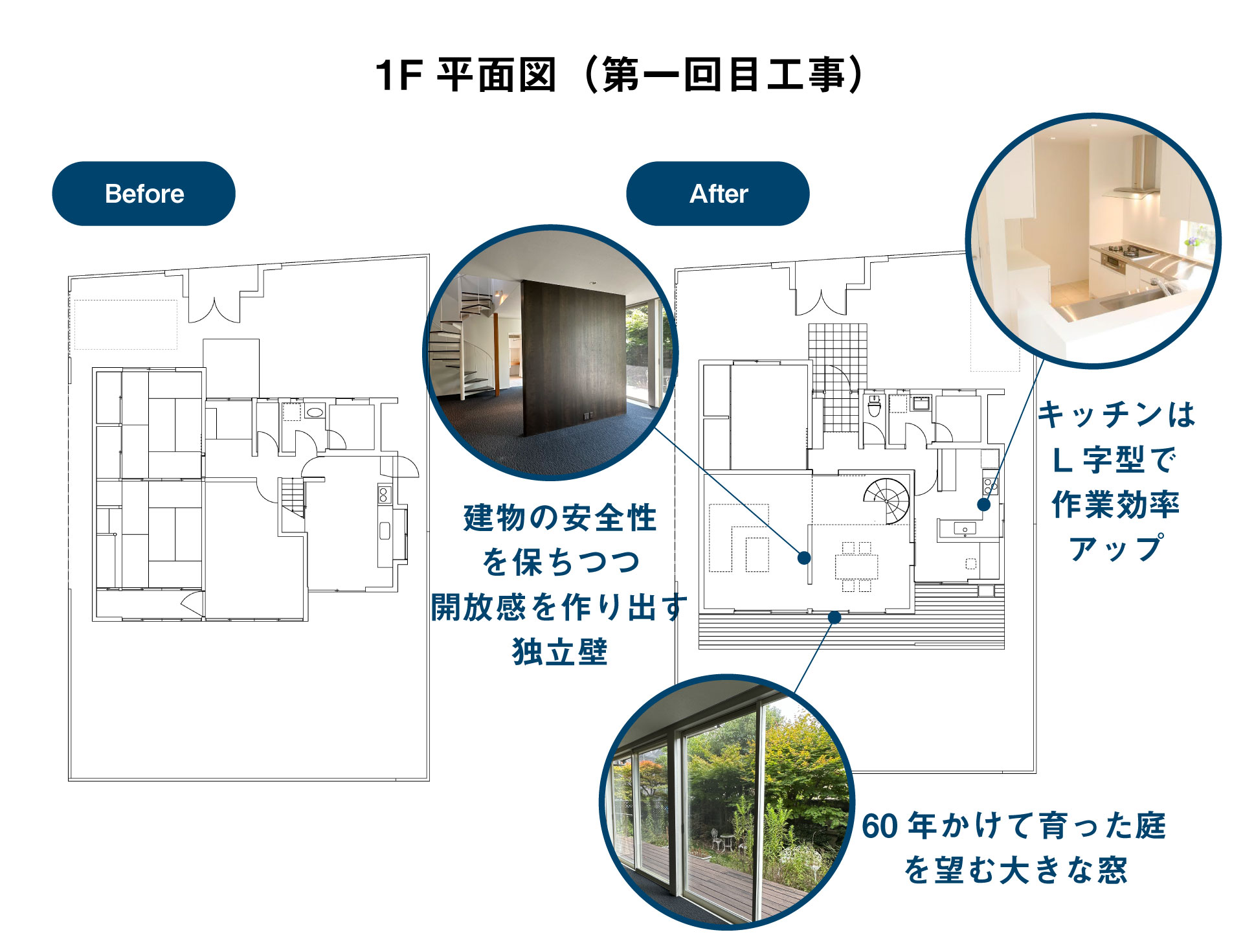 「私は東京の建築事務所で働いていて、京都に戻って独立したのですが、東京の友人が『両親が住む京都の実家をリノベーションしてほしい』と依頼してくれたんです。当時は築40年程で、1階は和室が続き間で2部屋あり、ダイニングキッチンとお風呂・洗面・トイレといった感じで3つに区切られているようなかたちでした。そこから、部屋をつないで一体化し、お祖父さんが長い間手をかけてきたお庭を毎日眺めながら暮らせるようにリノベーションしたんです」