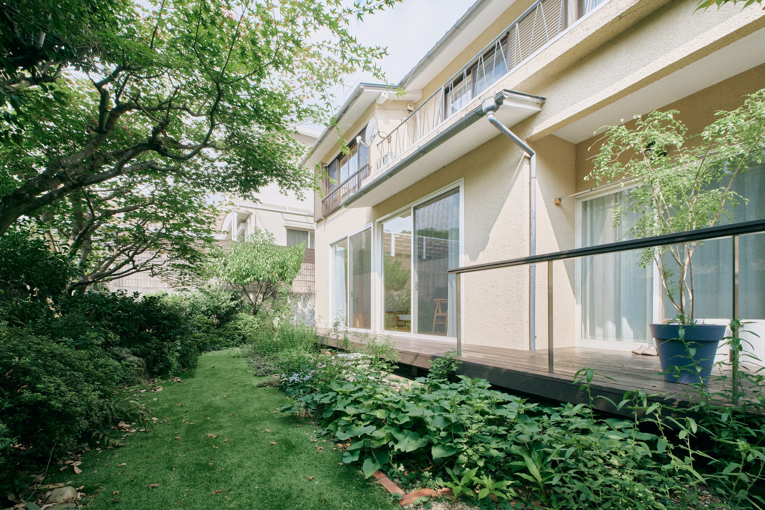 前に住まれていたオーナーさんが植えた木々を引き継いだ庭の風景。「春は新緑が美しく、秋は紅葉がとてもきれいですし、季節の移り変わりとともに、様々な花が咲いていくんです。これだけ樹木が育つには時間がかかりますし、60年かけて手入れされてできあがった庭というのは、やはり楽しい。こういうところは中古住宅の醍醐味ですね。」と波多野さん。