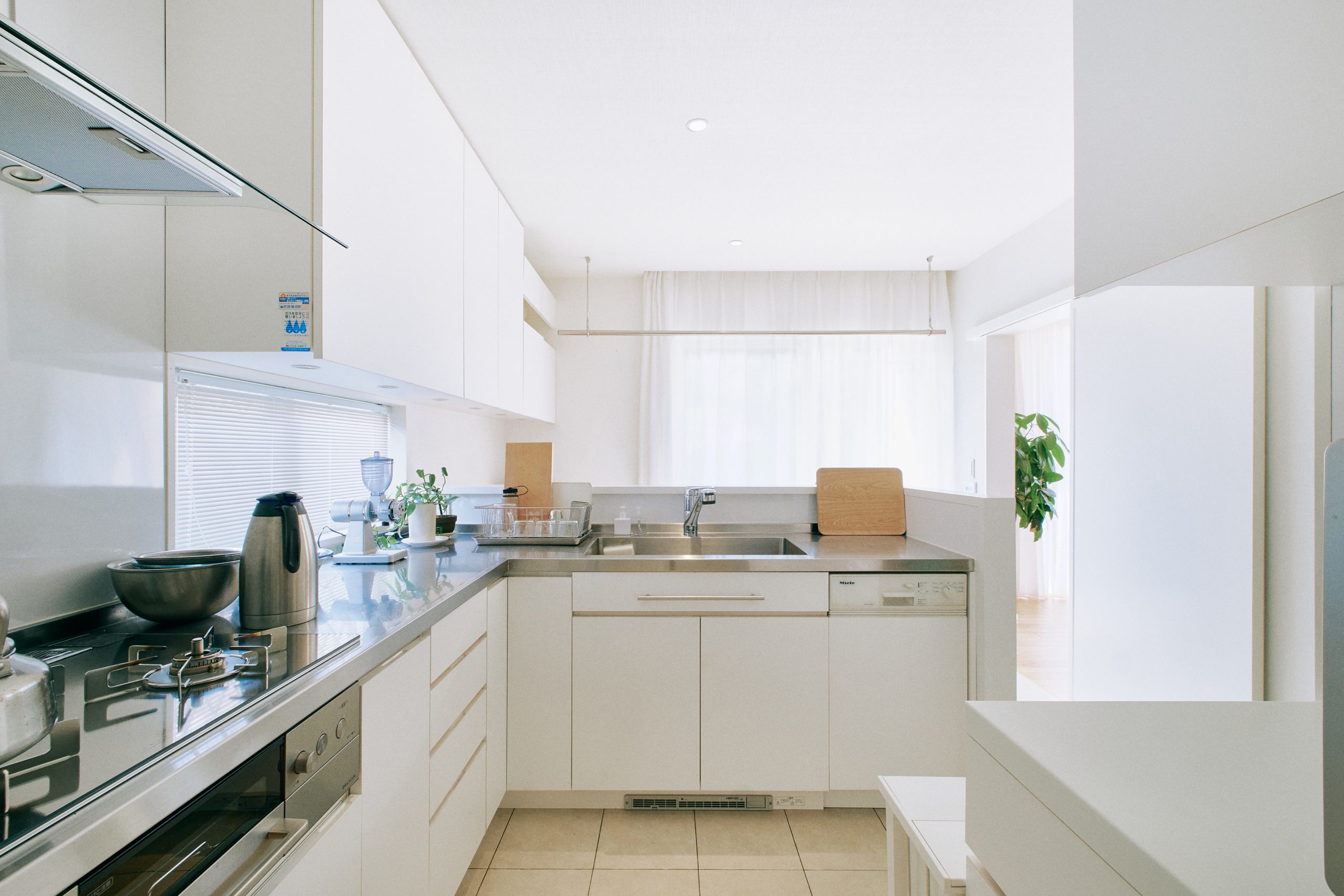 キッチンの位置はもともとの間取りのままで、レイアウトを工夫してL型キッチンにすることで作業効率をアップ。キッチンの隣には、家事をまとめてできるスペースを設けられています。