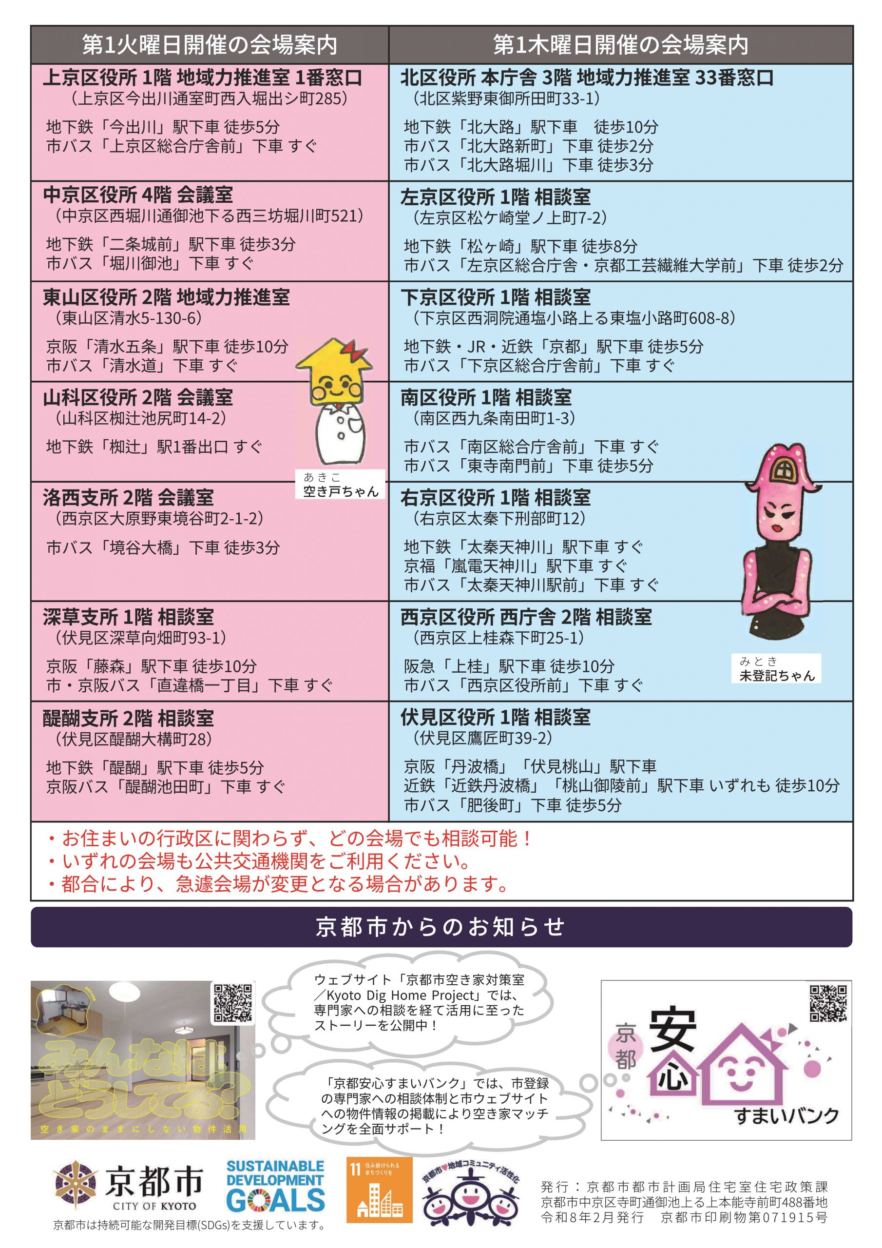 | 上京・中京・東山・山科区役所、深草・醍醐支所 | 4月7日、6月2日、7月7日、8月4日、9月1日、10月6日、12月1日、2月2日、3月2日 |